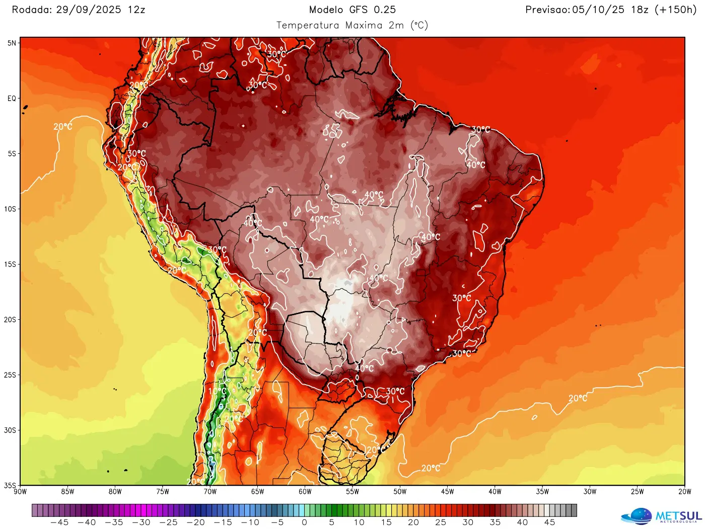 De acordo com a MetSul Meteorologia, uma bolha de calor centrada no interior do país provoca aquecimento intenso, acumulando máximas próximas ou acima dos 40 °C em várias capitais e regiões. A previsão é de que esse quadro perdure por vários dias, até que uma frente fria avance entre os dias 7 e 9 de outubro, trazendo chuvas e queda de temperatura para regiões do Sul, Sudeste e Centro-Oeste.