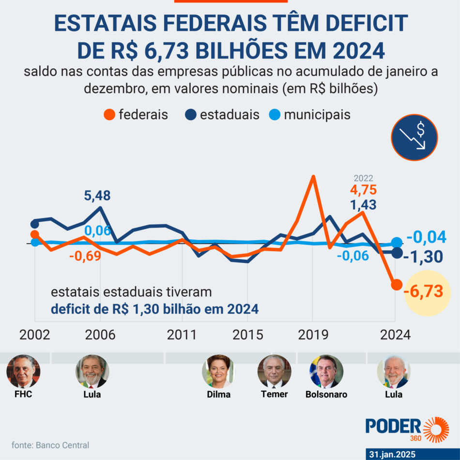 O prejuízo dos Correios puxou o rombo recorde das estatais federais em 2024, que somaram um déficit de R$ 8,07 bilhões, segundo o Banco Central — o maior da série histórica. Os Correios lideraram essa lista com R$ 3,2 bilhões de saldo negativo primário. Apesar disso, o governo argumenta que parte desse resultado se deve a um aumento de 44% nos investimentos das estatais, que chegaram a R$ 96 bilhões em 2024.